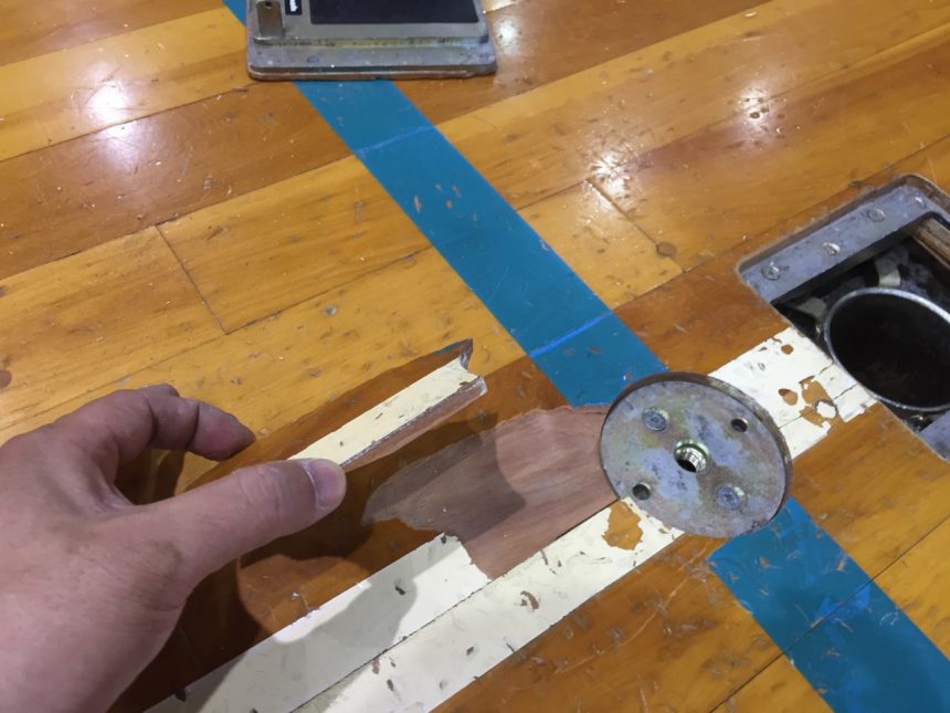 体育館床の状態としては、フローリングの破損個所が数カ所・ダボの抜け・体育館スポーツフロアー周囲に巻かれているエキスパンションゴムの劣化・部分的な損傷が見受けられました。